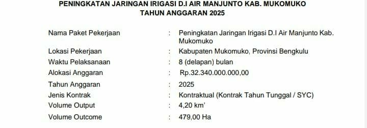 Mukomuko, Siberbengkulu.co -- Kementerian Pekerjaan Umum dan Perumahan Rakyat (PUPR) melalui Balai Wilayah Sungai (BWS) Sumatera VII mengucurkan anggaran sebesar Rp32 miliar untuk merehabilitasi jaringan irigasi Daerah Irigasi (DI) Air Manjunto di Kabupaten Mukomuko, Provinsi Bengkulu.