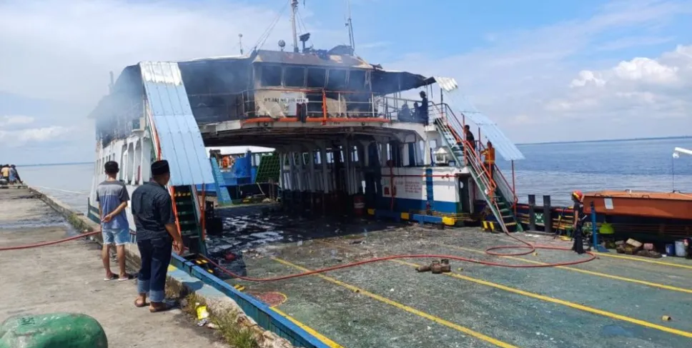 Kapal Motor Penyebrangan (KMP) Permata Lestari I, terbakar di Pelabuhan Badan Usaha Milik Daerah (BUMD),  PT. BUMI Laksamana Bandar Jaya (BLJ). (Foto: Mirwan)
