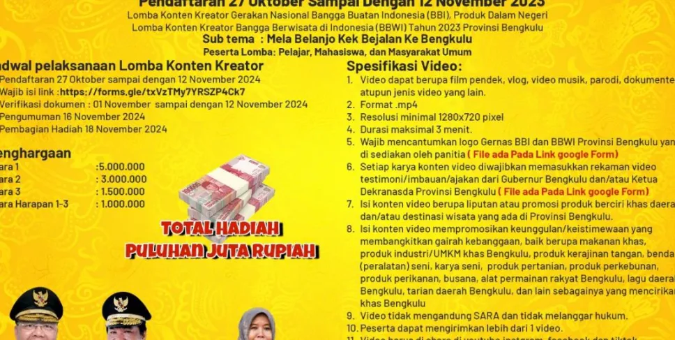 5. Wajib mencantumkan logo Gernas BBI dan BBWI Provinsi Bengkulu yang disediakan oleh panitia (File ada pada Link google Form).