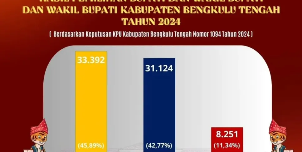 Sementara itu, Komisioner KPU Bengkulu Tengah, Sukardi, S.Sos., M.M, menegaskan bahwa rekapitulasi hasil pemilu di Kabupaten Bengkulu Tengah tidak mengalami perubahan setelah dilakukan pleno pada tingkat KPU Provinsi Bengkulu. Berdasarkan hasil rekapitulasi, paslon nomor 1, Rachmat Riyanto-Tarmizi, memperoleh 33.392 suara, paslon nomor 2, Evi Susanti-Rico Z Saputra, meraih 31.084 suara, dan paslon nomor 3, Sri Budiman-Septi Peryadi, hanya mendapatkan 8.251 suara.