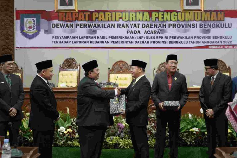 Laporan Hasil Pemeriksaan (LHP) atas Laporan Keuangan Daerah Provinsi Bengkulu tahun Anggaran 2022 dengan hasil opini WTP  dari BPK RI tersebut diserahkan langsung oleh Auditor Utama Keuangan Negara V (Tortama V) BPK RI Selamet Kurniawan kepada Gubernur Bengkulu dan Ketua DPRD Provinsi Bengkulu, pada Rapat Paripurna DPRD Provinsi Bengkulu, Jumat (12/5).