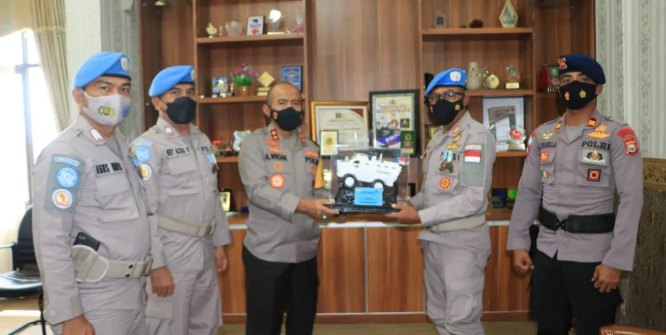 SIBERBENGKULU.CO, Bengkulu - Kapolda Bengkulu Irjen Pol. Drs. Agung Wicaksono, M.Si menyambut secara langsung tiga personil Polda Bengkulu yang telah mengharumkan nama Polda Bengkulu sepulang dari penugasan FPU Sudan-Afrika, Senin (08/03/2022). Ketiga personil tersebut diantaranya AKP Erwin Setiawan,Sik, MH (PS Wakil Komandan Batalyon Detasemen B Pelopor Brimob Bengkulu), Aipda Dedy Rastra Hirawan, S. Sos (bintara brimobda Bengkulu) dan Bripka Agus Noto Sampurno (Bintara Provos).